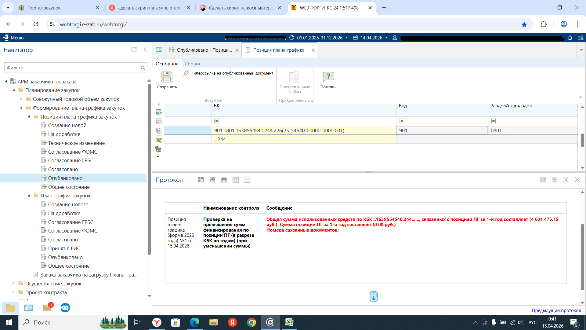 3.2 При формировании ПЗЗ выходит Блокирующий контроль (Превышение 1, 2 и/или 3 год 44ФЗ)